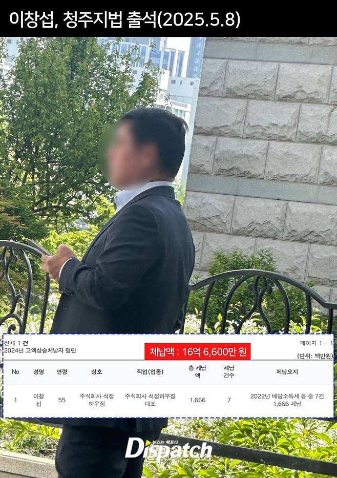 한편, 이창섭은 2024년 국세청 고액 상습 체납자 명단에도 올라가 있다. 그가 지금까지 내지 않은 세금은 16억 6,600만 원. 배당소득세 등 총 7건이다.