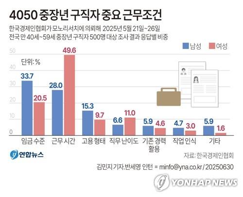 (서울=연합뉴스) 김민지 기자 = 30일 한국경제인협회가 발표한 4050 중장년 구직자 재취업 인식 설문조사 결과에 따르면 중장년 구직자가 재취업 시 가장 중요하게 여기는 조건이 남성은 임금, 여성은 근무 시간인 것으로 나타났다.