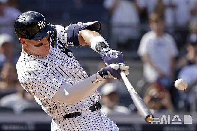 [뉴욕=AP/뉴시스] 뉴욕 양키스의 애런 저지가 29일(현지 시간) 미국 뉴욕 양키스타디움에서 열린 2025 메이저리그 오클랜드 애슬레틱스와의 경기 7회 말 2점 홈런을 치고 있다. 저지는 이날 멀티 홈런(29-30호)으로 홈런 단독 2위에 올라서며 4타수 2안타 4타점 3득점을 기록했으며 양키스는 12-5로 대승했다. 2025.06.30.