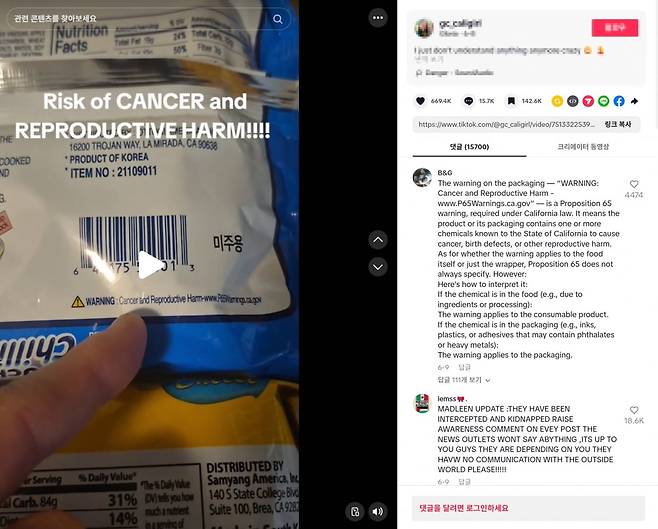 이는 틱톡 등 SNS에서 불닭볶음면 표지에 적힌 '경고: 암·생식장애 위험(Warning: Cancer and Reproductive Harm)' 문구를 놓고 이게 무엇이냐는 식의 영상이 늘어난 탓이다. 불닭볶음면이 글로벌 인기를 얻으면서 불닭볶음면 봉지를 살펴보며 문구에 대해 문제제기를 하는 영상들이다.