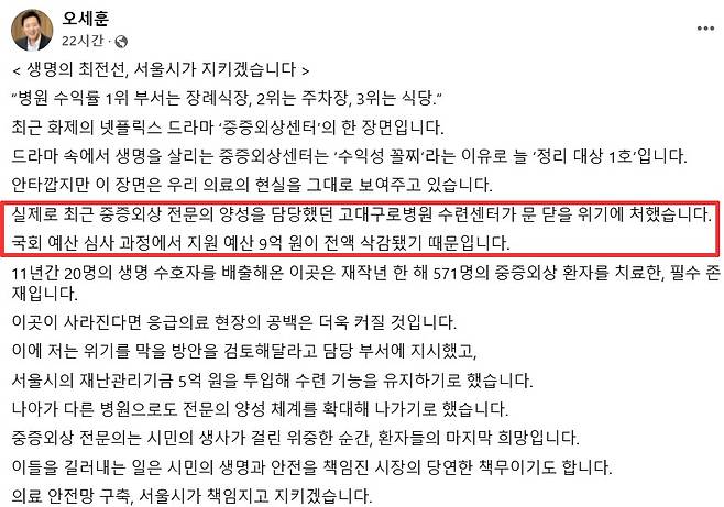 | ▲ 오세훈 서울시장이 6일 자신의 소셜미디어(SNS)에 “최근 중증외상 전문의 양성을 담당했던 고대구로병원 수련센터가 문 닫을 위기에 처했다”면서 “국회 예산 심사 과정에서 지원 예산 9억 원이 전액 삭감됐기 때문”이라고 주장했다. |
