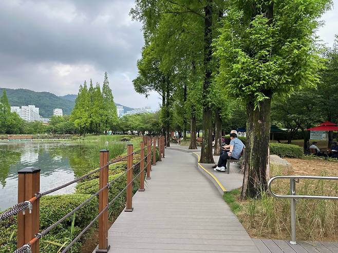 이런 차원에서 연지공원 호수 주변 650m 구간 부정형 판석 산책로 구간을 데크와 황토포장 산책로로 조성했다.