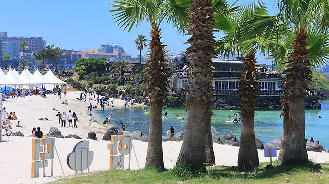 ▲ 제주도 동부에 폭염경보, 북부와 중산간에 폭염주의보가 내려진 29일 제주시 조천읍 함덕해수욕장에서 피서객들이 물놀이하거나 바닷바람을 쐬며 여름 정취를 즐기고 있다.