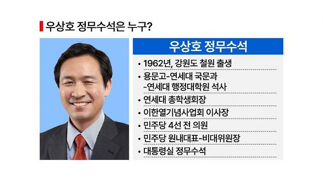 1962년, 강원도 철원 동송읍에서 태어난 우상호 대통령실 정무수석은 원내대표에 비대위원장까지 지낸 전직 4선 의원이다. 대개 초·재선급이 역대 정무수석을 맡아 왔던 것을 돌이켜보면 이례적이다. 전직 3선 의원인 강훈식 비서실장(1973년생)보다 선수가 높고 나이도 11살 많다. 정치적인 체급이나 경험, 부드러운 성격 등을 종합해보면 우 수석은 대통령실 내에서 '큰 형님' 같은 역할을 할 것으로 예상된다.