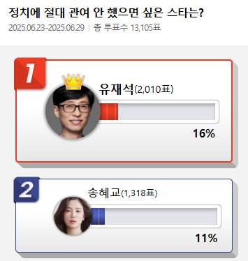 총 투표수 13,105표 중 2,010(16%)표로 1위에 오른 유재석은 과거 예능 '유퀴즈 온 더 블럭'에 당시 당선인 신분이었던 윤석열 전 대통령이 출연해 논란이 불거진 바 있다. 평소 민감한 정치 현안과 거리를 둬온 것으로 알려져 있는 유재석은 지난해 유튜브에서 비상계엄 사태 이후 처음으로 어지러운 시국을 간접적으로 언급해 눈길을 끌었다.