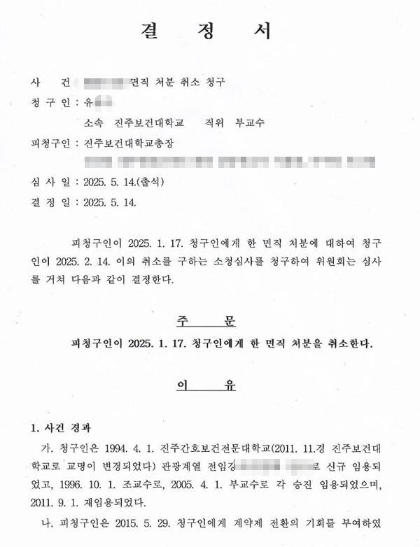 | ▲ 진주보건대 교수 면직 처분 취소 청구 관련한 교원소청심사위원회의 결정문 일부. |