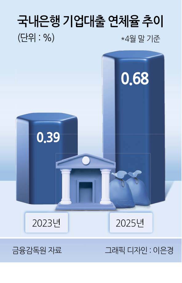 금융감독원에 따르면 지난 4월 말 기준 국내은행의 기업대출 연체율은 0.68%로 지난 2023년 4월 말(0.39%) 대비 0.29%포인트 올랐다. 특히, 올해 4월 말 중소기업의 연체율은 0.83%로 대기업(0.13%)보다 6배 넘게 높았다.