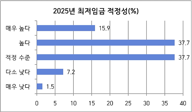 ‘경영 상황 대비 2025년 최저임금 수준 적정성’에 대해 ‘매우 높음’ 15.9%, ‘높음’ 37.7%로 응답자의 53.6%가 ‘높다’고 답했다. ‘적정 수준’은 37.7%였으며, ‘다소 낮음’ 7.2%, ‘매우 낮음’ 1.5%로 ‘낮다’고 생각하는 비중은 8.7%밖에 되지 않았다. <아래 표>