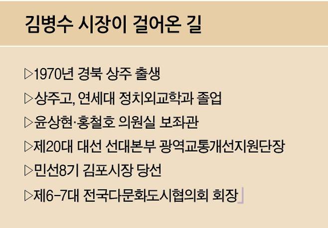 “지난 시간 어느 시장들보다 많은 일을 했다고 생각한다. 남은 기간은 그 일들을 잘 마무리하는 시간”이라던 말과 달리, 지난 2년여 동안 추진했던 사업을 매듭지어야 한다는 목소리엔 힘이 실렸다. 김 시장은 김포에서 재선을 지낸 홍철호 전 국민의힘 의원의 보좌관 출신으로 일찌감치 지역 발전 계획에 뛰어들었다. 그 중 5호선 연장 확정과 김포한강2콤팩트시티 선정 등은 시장 임기 초반 성과를 거두며 추진했던 핵심 사업들이다.
