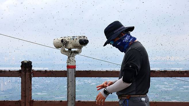 오늘 계양산 정상을 찾은 등산객들은 연신 손을 휘젓고 부채질하며 러브버그를 쫓아내다가 서둘러 몸을 피했습니다.