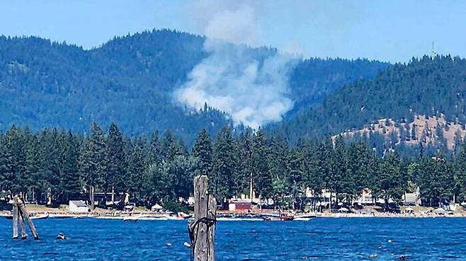 ▲ 29일(현지시간) 대응 소방관들이 총에 맞은 아이다호 쿠어 달렌 근처 화재에서 연기가 피어오르고 있다.