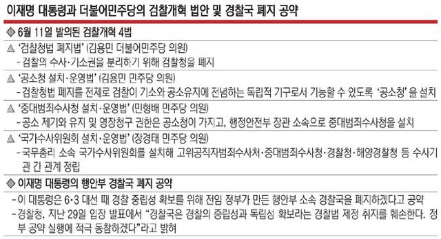 정성호 법무부 장관 지명자가 30일 검찰개혁에 대한 강한 의지를 드러내면서 검찰의 수사·기소권 분리를 골자로 하는 제도개혁이 속도를 낼 것으로 전망된다. 법무부와 검찰 요직을 두루 거친 봉욱 전 대검찰청 차장이 민정수석에 임명된 만큼 개혁 실무 작업도 힘을 받을 것으로 보인다. 행정안전부 산하 경찰국 폐지 논의는 윤호중 행안부 장관 지명자를 중심으로 검찰개혁과 맞물려 진행된다.