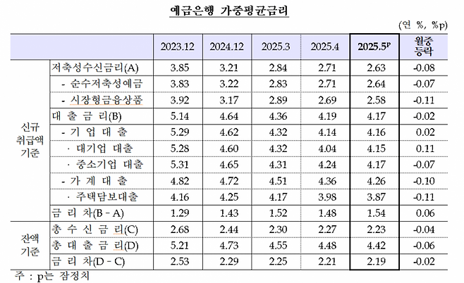 예대금리차(신규 취급액 기준)는 1.54%포인트로 전월 대비 0.06%포인트 늘었다. 대기업 대출금리 확대의 영향으로 한 달 만에 확대 전환했다. 김민수 한은 경제통계1국 금융통계팀장은 "대기업 대출에서 지난 4월 저리의 정책자금 대출 영향이 해소되면서 상승 압력이 작용했다"며 "이런 특이 요인을 제외하면 대기업 대출 금리는 소폭 하락, 예대금리차도 소폭 상승한 것으로 추정한다"고 말했다.