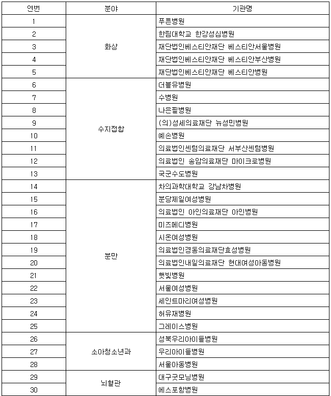 복지부는 이달 5∼20일 신청을 받아 심의 결과를 토대로 시범사업을 수행할 병원 30곳(화상 5곳·수지접합 8곳·분만 및 소아 15곳·뇌혈관 2곳)을 선정했다.