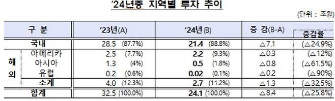 대상별로는 국내·외 431사에 투자가 이뤄졌다. 건별 투자액은 평균 559억원 수준으로 전년 734억원 대비 175억원(23.8%) 감소했다. 지역별로는 국내 투자가 21조4000억원으로 전년 대비 24.9% 감소했다. 해외도 2조7000억원으로 32.5% 줄었다.