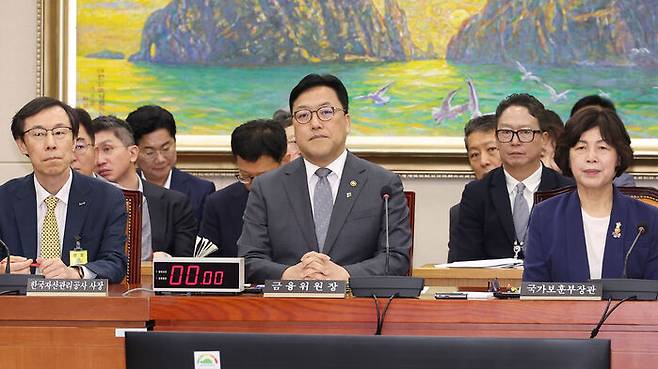 ▲ 30일 국회에서 열린 정무위원회 전체회의에 참석한 정정훈 한국자산관리공사 사장(왼쪽부터), 김병환 금융위원장, 강정애 국가보훈부 장관이 의원들의 인사말 등을 경청하고 있다.