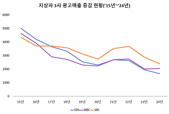 방송매출 감소의 직접적인 원인은 방송광고매출의 급감이다. 지난해 방송광고매출은 전년 대비 2019억원(8.1%) 줄어든 2조2964억원으로 집계됐다. 지상파 광고매출은 무려 919억원(9.9%)이 줄었다. 지상파 광고매출은 2023년 처음으로 1조원 선이 무너진 이래 지난해 다시 앞자리가 바뀌며 8000억원대까지 떨어졌다.
