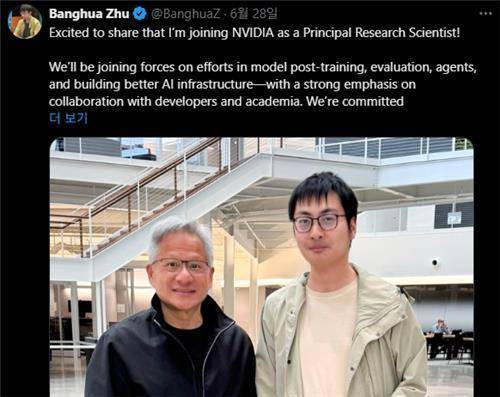 주방화는 자신이 엔비디아의 기업용 AI 에이전트를 담당하는 '네모트론' 팀의 주임 연구원을 맡게 됐다고 했고, 자오젠타오는 "범용인공지능(AGI)과 초인공지능(ASI)의 경계를 확장하는 데 기여하기 위해" 엔비디아에 합류했다고 설명했습니다.