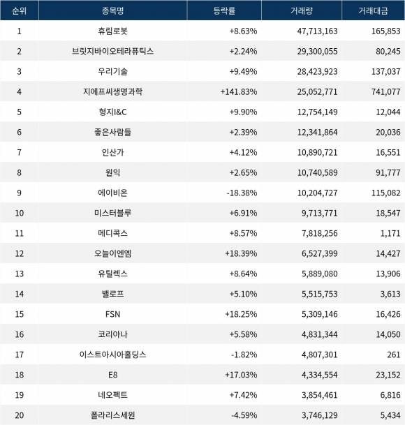 한편 거래량 상위 20위권 종목들은 메디콕스(054180) ▲8.57%, 오늘이엔엠(192410) ▲18.39%, 유틸렉스(263050) ▲8.64%, 밸로프(331520) ▲5.10%, FSN(214270) ▲18.25%, 코리아나(027050) ▲5.58%, 이스트아시아홀딩스(900110) ▼1.82%, E8(418620) ▲17.03%, 네오펙트(290660) ▲7.42%, 폴라리스세원(234100) ▼4.59% 등의 성적을 기록했다.