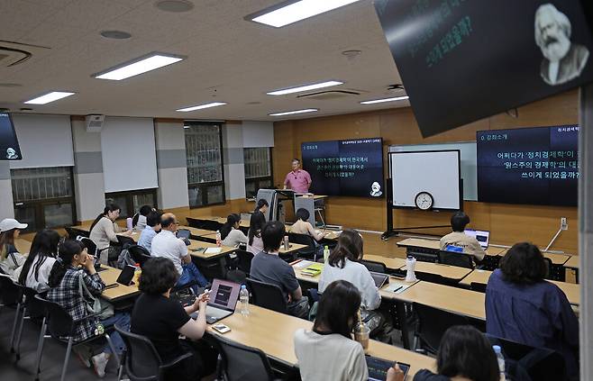 '서울대학교 내 마르크스경제학 개설을 요구하는 학생들'(서마학)은 2025년 6월24일 서울 관악구 서울대 16동에서 '0학점 공개강의'인 정치경제학입문 첫 강의를 열었다.