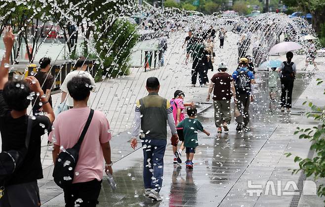 [서울=뉴시스] 배훈식 기자 = 서울에 올해 첫 폭염주의보가 발효된 30일 오후 서울 종로구 광화문광장에서 관광객들이 바닥분수 터널을 걸으며 더위를 식히고 있다. 2025.06.30. dahora83@newsis.com