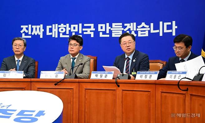 [헤럴드경제=이상섭 기자] 박일준 대한상공회의소 상근부회장이 30일 오전 서울 여의도 국회에서 열린 더불어민주당-경제 6단체와 이재명 대통령 공약 사항인 상법 개정 간담회에 참석해 모두발언하고 있다.