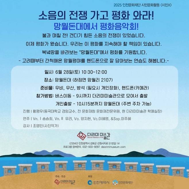 새 정부에서 전단 살포 금지와 함께 대북 확성기 방송을 중단하자, 북에서도 대남방송을 자제하고 있단다. 천만다행이다. 지난 6월 28일(토) 오전 10시 30분, 북녘땅이 바라보이는 망월돈대에서 강화 더리미미술관 주최 평화음악회가 열렸다.