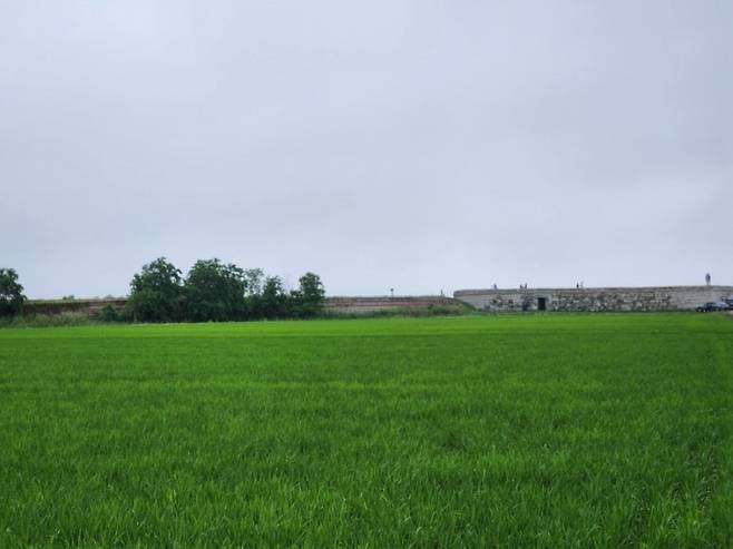 | ▲ 아름다운 푸른 들판과 망월돈대. 한 폭의 그림 같다. |