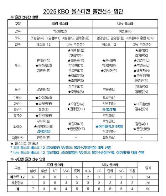 이에 따라 드림 올스타 외야수 총점 4위를 기록한 삼성 김지찬이 윤동희를 대신해 베스트 12로 나서며, 나눔 올스타 에서는 3루수 부문 2위 키움 송성문, 외야수 부문 4위 키움 이주형이 각각 김도영과 플로리얼을 대신해 베스트 12 선수로 올스타전에 참가한다.