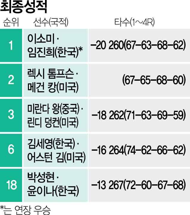 4라운드는 포볼(각자 볼 치기) 방식으로 치러졌고 18번 홀에서 진행된 연장은 포섬(번갈아 치기)이었다. 선두에 1타 뒤진 공동 2위로 4라운드를 출발해 버디 8개로 8타를 줄인 임진희·이소미다. 톰프슨·캉은 10타나 줄였다.