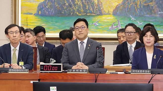 ▲ 30일 국회 정무위원회 전체회의에 참석한 정정훈 한국자산관리공사 사장(왼쪽부터), 김병환 금융위원장, 강정애 국가보훈부 장관