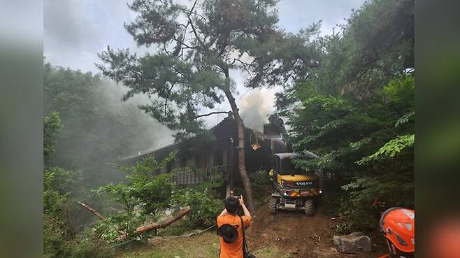 국가유산청은 송석정 지붕 내부에 연기가 발생해 지붕을 파괴해 진화하도록 조치했다고 밝혔습니다.