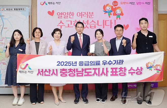 (서산=뉴스1) 이동원 기자 = 이완섭 서산시장, 관계 공무원들이 30일 시청 시장실에서 응급의료 유공 우수기관에 선정돼 충청남도지사 표창을 받은 것을 기념했다.