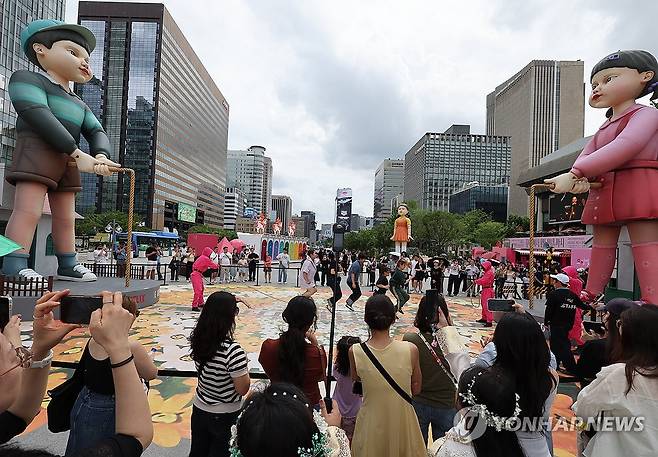 (서울=연합뉴스) 서명곤 기자 = 30일 서울 광화문광장에서 2025 K콘텐츠 서울여행주간을 맞아 열린 오징어게임 팝업 광화문 행사에서 시민과 외국인 관광객들이 단체줄넘기 게임을 즐기고 있다. 2025..6.30
