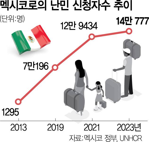 30일 유엔난민기구(UNHCR)에 따르면 2023년 기준 멕시코에 난민을 신청한 외국인은 14만 명으로 역대 최다를 기록했다. 10년 전 수천 명 수준에서 10만 명대로 급증한 것이다. 이들의 국적은 주로 쿠바·베네수엘라·온두라스·아이티·콜롬비아·과테말라인 것으로 나타났다.