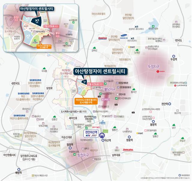 아산탕정자이 센트럴시티는 천안에서 주거 선호도가 가장 높은 불당지구와 대규모 택지 조성 사업인 아산탕정2지구를 연결하는 중심부에 자리 잡고 있다. 불당지구는 아산·천안권 부동산 시세를 선도하는 지역이다. 아산탕정자이 센트럴시티는 불당지구와 고가로 연결될 계획이라 불당지구의 우수한 인프라도 누릴 수 있다.