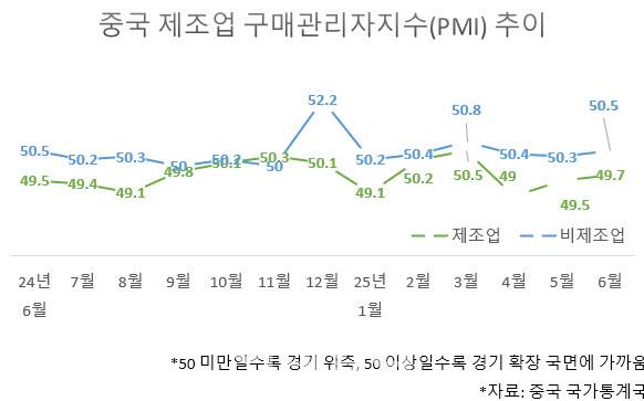 30일 중국 국가통계국에 따르면 6월 제조업 PMI는 49.7을 기록했다. 이는 시장 예상치(49.6)을 소폭 웃돌고 전월대비 0.2포인트 상승한 수준이다. 다만 지난 4월(49.0) 이후 3개월째 기준인 50을 밑돌았다.