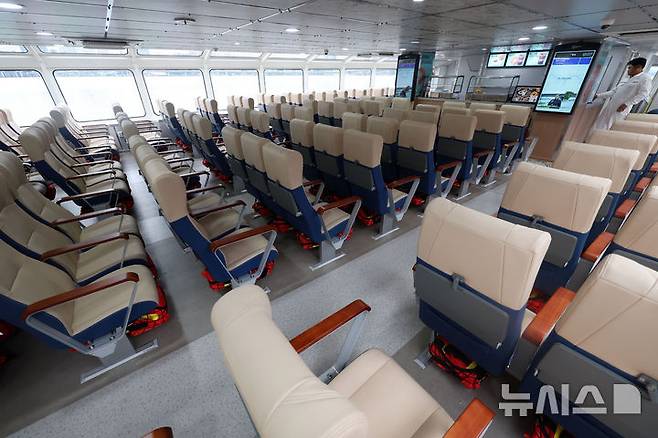 [서울=뉴시스] 홍효식 기자 = 서울시 한강버스가 시민 체험 시범 운항을 하루 앞둔 30일 한강버스 좌석 모습.