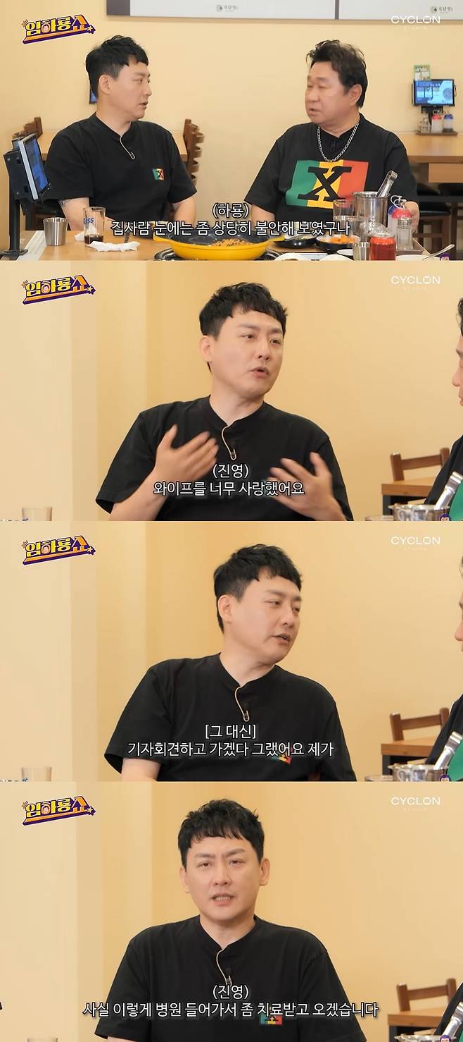 이를 들은 임하룡은 "집사람 눈에는 좀 상당히 불안해 보였구나"라고 공감했고, 현진영은 "그래서 어쩔 수 없이 병원에 갔다. 와이프를 너무 사랑했다. (그 대신) 제가 기자회견하고 가겠다 그랬다"라며 기자회견을 연 이유를 밝혔다.