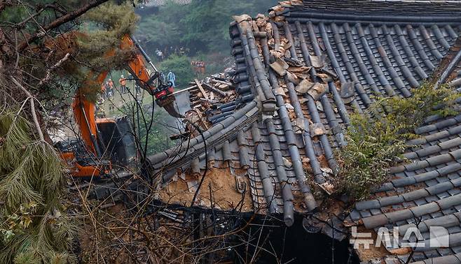 [서울=뉴시스] 조성우 기자 = 30일 오후 서울 성북구에 위치한 명승 성북동 별서 내 송석정에서 화재가 발생해 소방대원들이 포크레인을 이용해 진화 작업을 하고 있다. (공동취재) 2025.06.30. photo@newsis.com