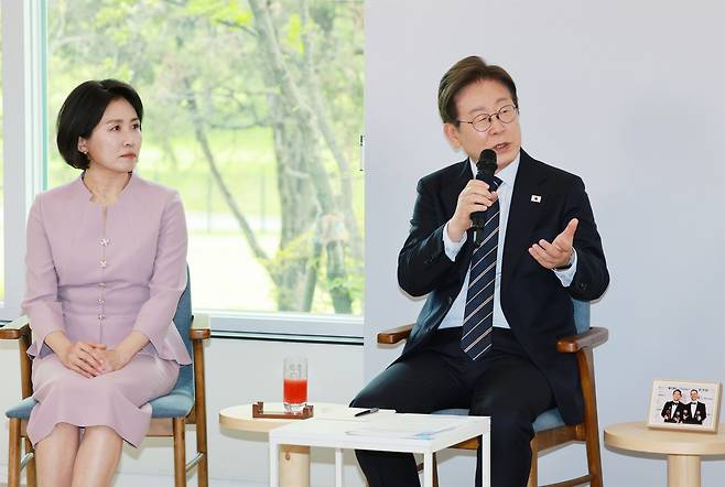| ▲ 이재명 대통령이 30일 서울 용산 대통령실 파인그라스에서 열린 문화예술계 수상자 간담회에 김혜경 여사와 함께 참석해 발언하고 있다. 2025.6.30 [대통령실통신사진기자단] |
