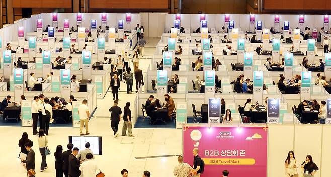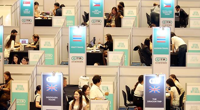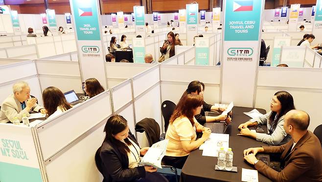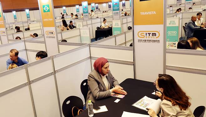 30일 서울 강남구 삼성동 코엑스에서 열린 ‘2025 서울국제트래블마트(SITM)'에서 국내외 관광업체 간 비즈니스 상담이 열리고 있다. 서울국제트래블마트는 세계 각국의 관광업계 관계자들이 한자리에 모여 여행 정보를 나누고 협력 기회를 만드는 국내 최대 규모의 관광 비즈니스 행사다.