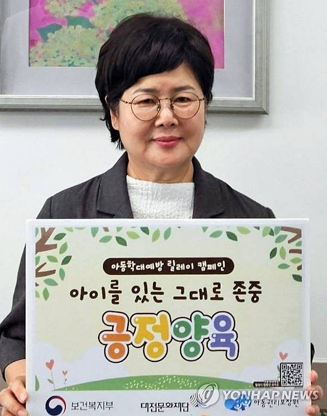 (대전=연합뉴스) 대전문화재단 백춘희 대표가 30일 대전예술가의집에서 보건복지부와 아동권리보장원이 공동으로 추진 중인 '아동학대 예방 릴레이 캠페인'에 동참하고 기념촬영을 하고 있다.2025.6.30 [대전문화재단 제공. 재판매 및 DB 금지]