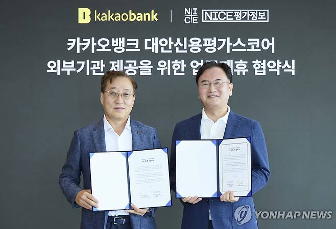 (서울=연합뉴스) 30일 경기 성남시 카카오뱅크 판교 오피스에서 열린 '대안 신용평가 스코어 외부기관 제공을 위한 업무 협약식'에서 윤호영 카카오뱅크 대표(왼쪽)와 김종윤 NICE평가정보 대표이사가 기념 촬영하고 있다. 2025.6.30 [카카오뱅크 제공. 재판매 및 DB 금지]