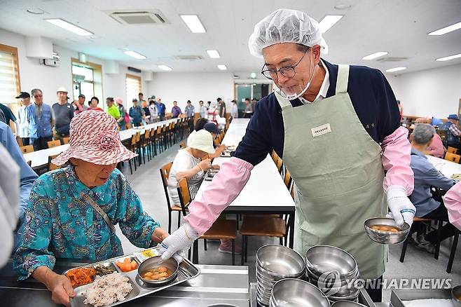 (울산=연합뉴스) 30일 이순걸 울산시 울주군수(오른쪽)가 취임 3주년을 맞아 울주군 삼남읍 서부노인복지관을 방문해 시설 이용자들의 애로사항을 청취하고 격려한 뒤 경로식당에서 어르신 500여 명을 위해 배식 봉사활동을 했다. 2025.6.30 [울주군 제공.재판매 및 DB 금지]