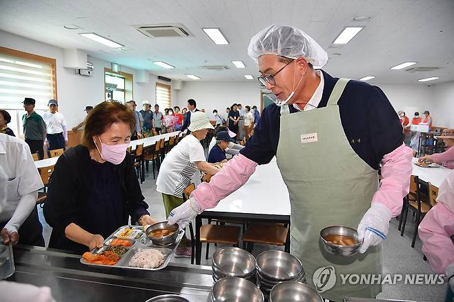 (울산=연합뉴스) 30일 이순걸 울산시 울주군수(오른쪽)가 취임 3주년을 맞아 울주군 삼남읍 서부노인복지관을 방문해 시설 이용자들의 애로사항을 청취하고 격려한 뒤 경로식당에서 어르신 500여 명을 위해 배식 봉사활동을 했다. 2025.6.30 [울주군 제공.재판매 및 DB 금지]
