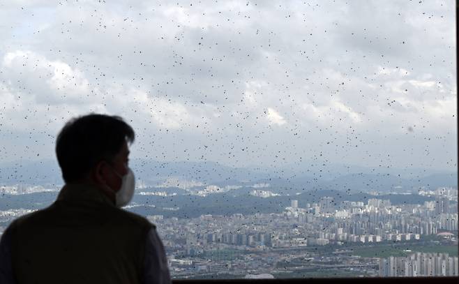 러브버그(붉은등우단털파리)가 대량발생한 30일 인천시 계양구 계양산 정상에서 수 없이 많은 벌레들이 날아다니고 있다. 이날 산을 오르며 만난 등산객들은 몸에 붙은 벌레들을 털어내며 등반했다.