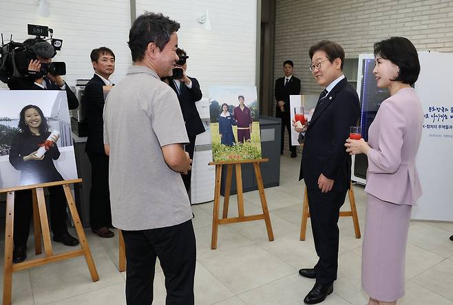 이재명 대통령과 김혜경 여사는 행사장으로 입장하며 K-컬처의 주역의 활약상이 담긴 사진을 감상하며 환담을 나눴다.