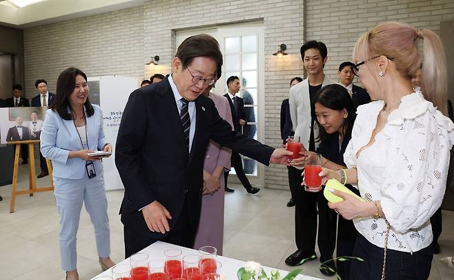 이재명 대통령과 김혜경 여사는 행사장으로 입장하며 K-컬처의 주역의 활약상이 담긴 사진을 감상하며 환담을 나눴다. 환담 전 참석자들에게 직접 음료를 전달하기도 했다. 이어 무대로 이동해 본격적인 간담회를 가졌다.