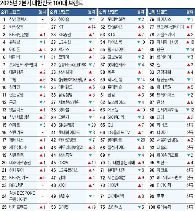 삼성 갤럭시와 카카오톡이 ‘대한민국 100대 브랜드’ 부동의 1, 2위로 자리 잡은 가운데 KB국민은행이 유튜브를 제치고 3위를 탈환했다. 아이폰은 석 달 만에 4계단 뛰어올라 5위를 차지했으며 쿠팡이 ‘톱10’에 다시 이름을 올렸다.